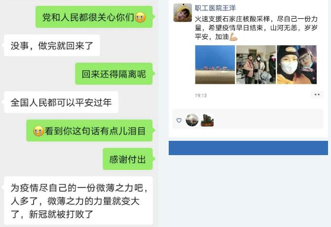 陳思宇是一名職工醫(yī)院的護士,團支部書記,同時也是共產(chǎn)黨員,業(yè)務(wù)能力強,責(zé)任心強,接到通知后,她表示堅決服從組織安排?!?span id="km8deqw" class="highlight">唯一有些顧慮的就是孩子還小,從來沒有離開過媽媽。但是家里孩子的奶奶爺爺、姥姥姥爺非常支持,覺得這是一件非常有意義的事兒,他們一定會好好照顧孩子,全家人的支持把我的顧慮都解決了。然后我就特別灑脫的坐上了去石家莊支援的車?!标愃加钚χf。